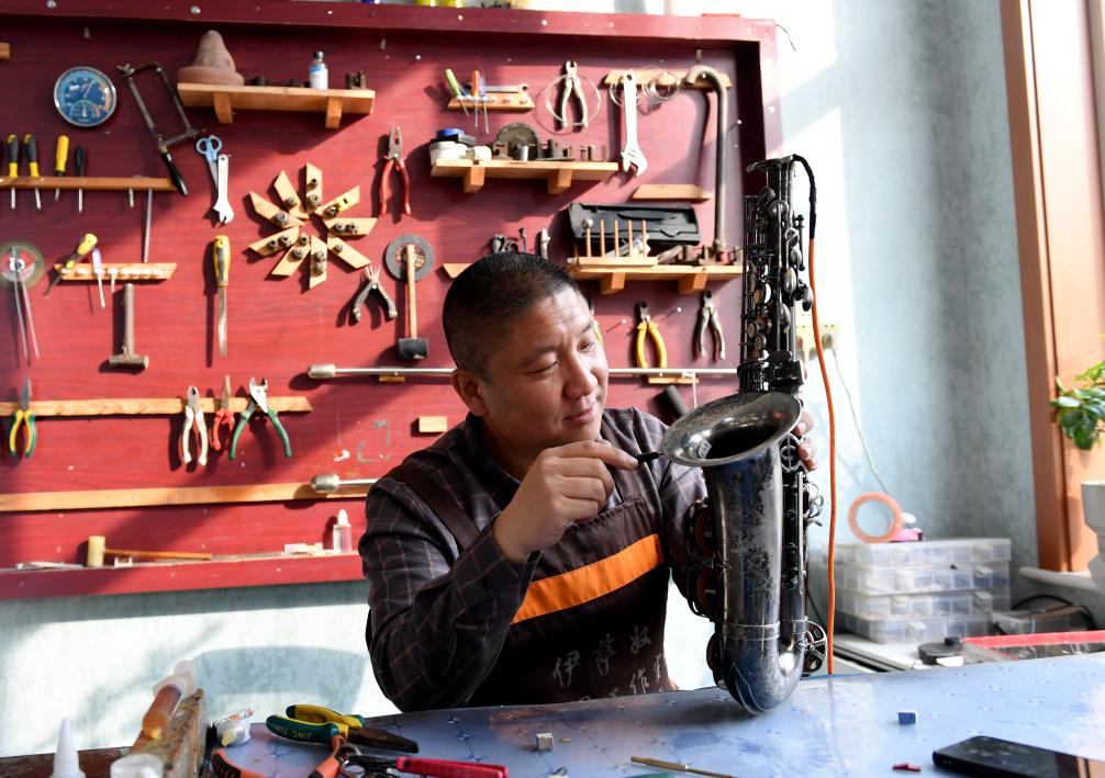 周卫仓在工作室内维修萨克斯。新华社发(苏小立 摄)