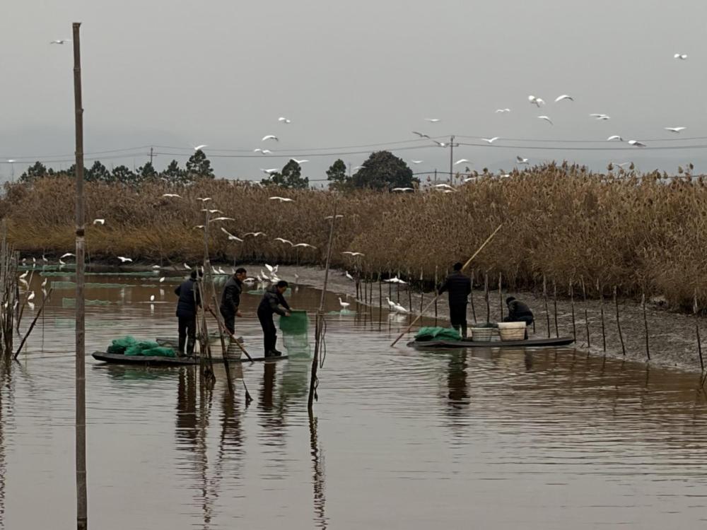 冬日海风凛冽,却挡不住收获的热闹。柳伟宾与几位赶来帮忙的乡邻撑筏入塘,熟练地收拢地笼。一网网白虾在晨光中活蹦乱跳,被倒入筐中。妻子手持笔记本,仔细记录称重数据:“52斤、58斤、49斤……”