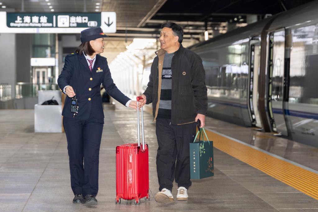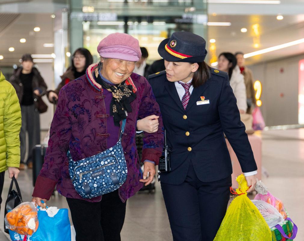 2月14日,在上海南站,车站“心尚”服务工作室客运员周佳(左)协助66岁的毕先生出站。毕先生从浙江桐庐来上海,今年是第一次到儿子的新家过年。