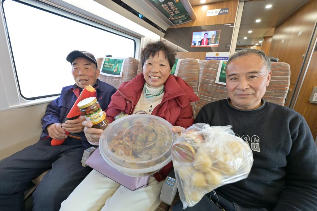 2月14日,在G6685次列车上,来自河南开封杞县的旅客程先生(右)和家人展示准备带去北京的炸丸子、小酥肉、腌菜等自制家乡食品。程先生的儿子在京工作,他带着爱人、老父亲一起去北京团圆过年。