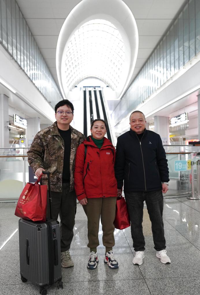 2月14日,在杭州西站,从事互联网工作的朱鹏(左)接到从江苏泰州坐高铁来杭州过年的母亲赵女士(中)、父亲朱先生。朱鹏说,他接父母来新房子过新年,还计划带父母在杭州逛一逛。