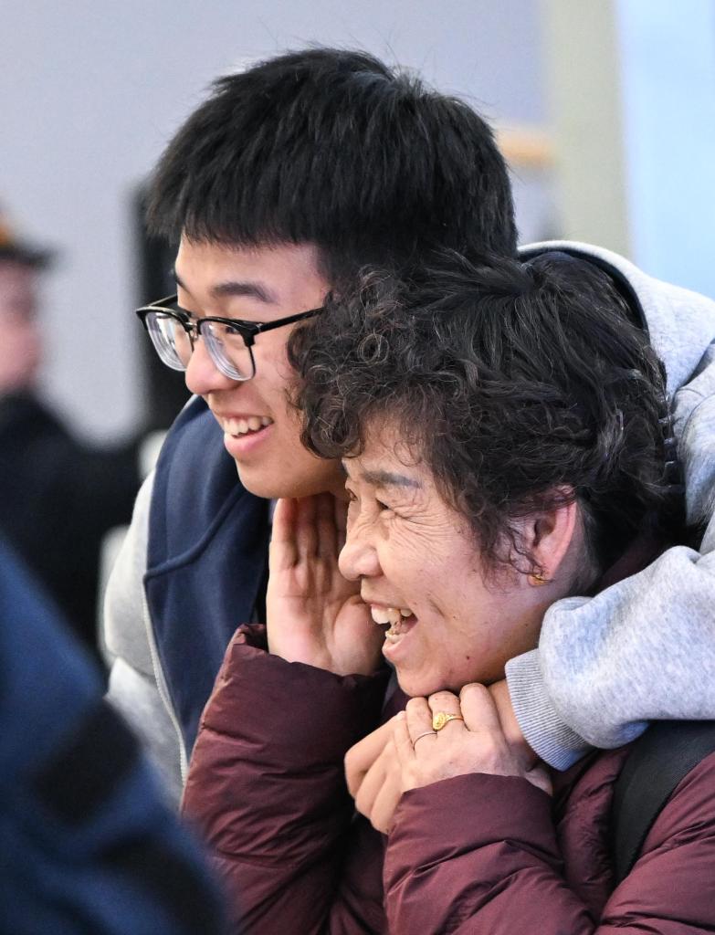 2月7日,在广州南站到达大厅,来自广东潮州的林女士拥抱前来接站的儿媳。