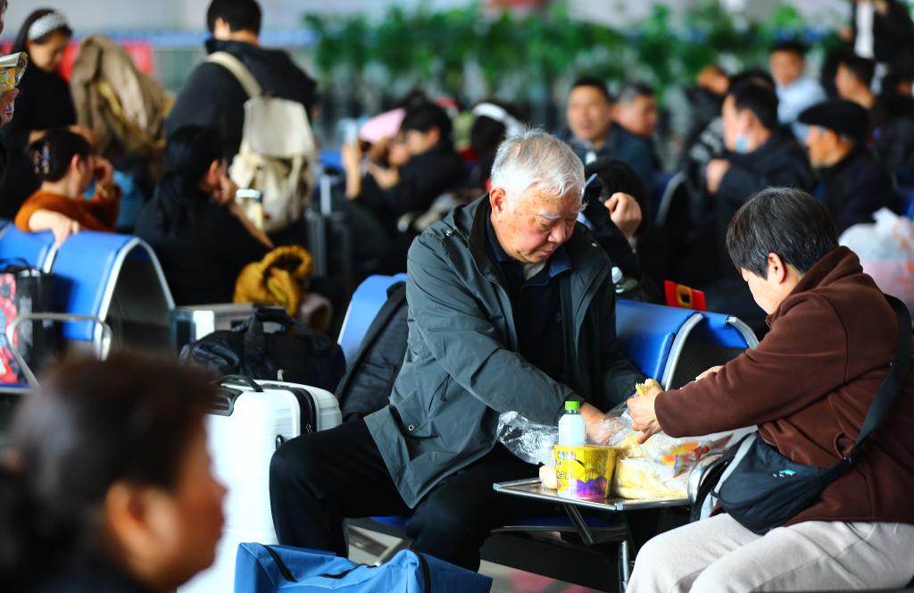 2月14日,在河南周口站,家住周口沈丘县、今年69岁的李先生同老伴在候车室简单就餐。他们准备乘车前往广州与家人团聚,共度新春佳节。