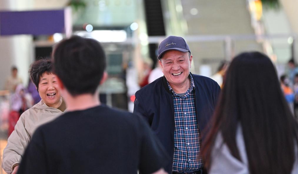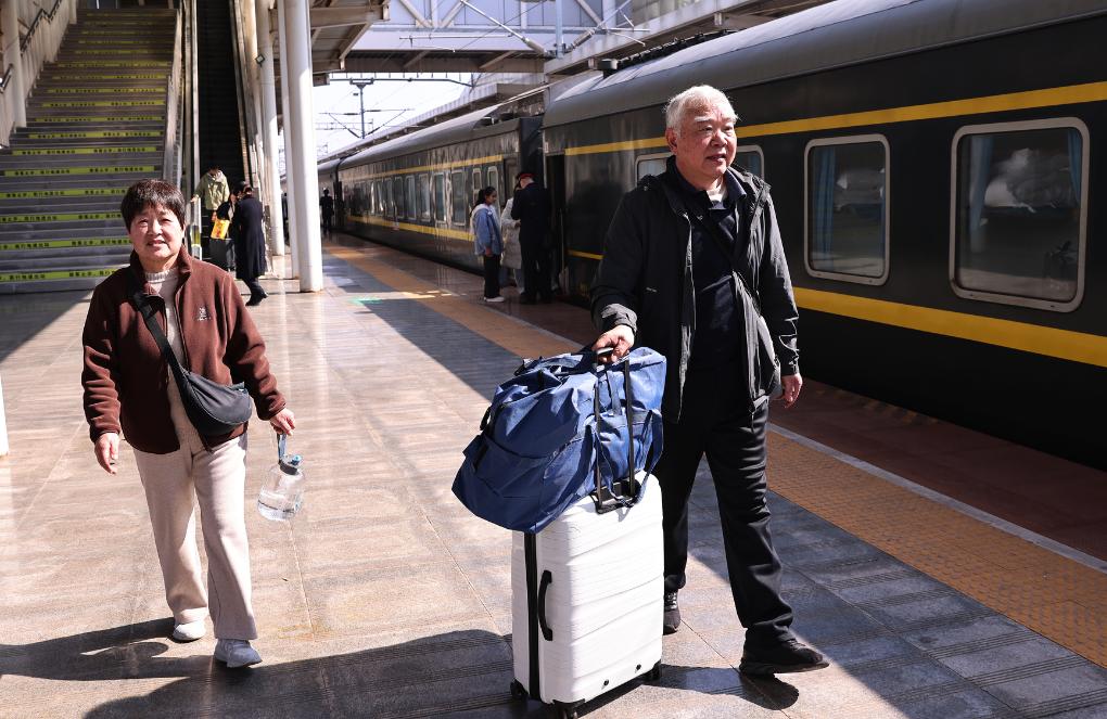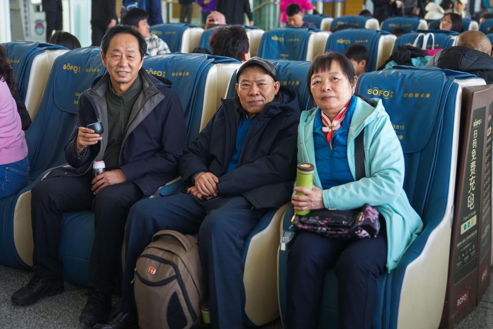 2月14日,在河南兰考南站,来自河南开封杞县的旅客程先生(右二)带着爱人、老父亲准备乘坐G6685/G376次列车赶赴北京,与孩子团聚。春运期间,G6685/G376次列车成为开封、兰考等地旅客去北京、郑州等城市“反向春运”的热门选择。郑州客运段高铁一队京郑班组加强对老年旅客的问询引导和精准帮扶,为“反向春运”之旅营造温馨的出行氛围。
