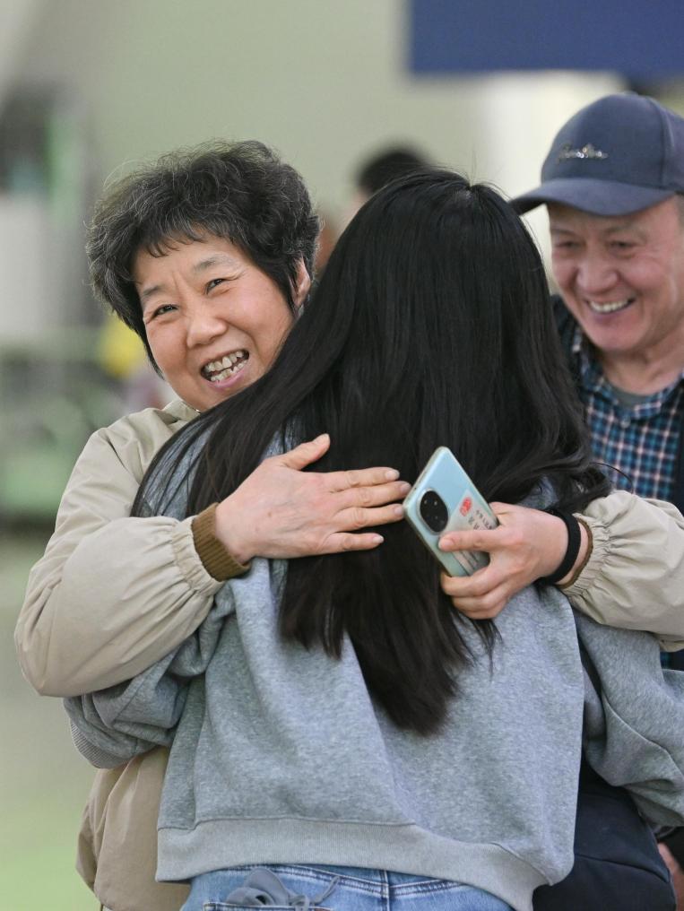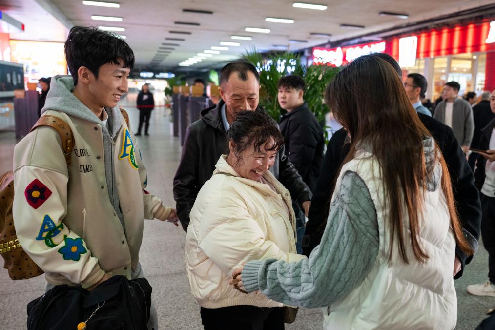 2月14日,在湖北武昌站,王女士(右一)与家人相会,一家人的开心写在脸上。