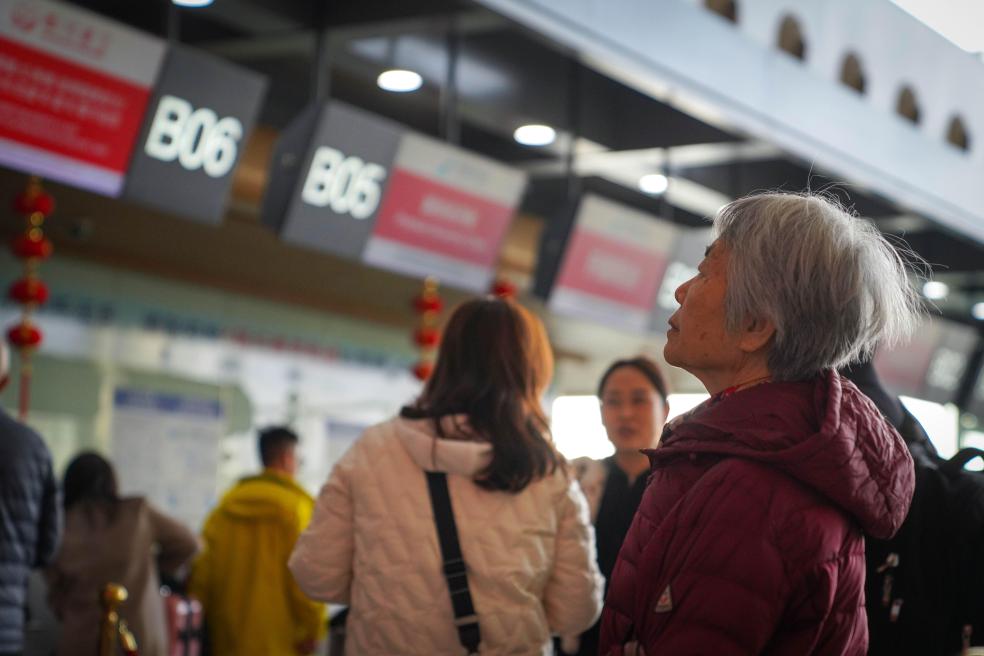 2月13日,在长春龙嘉国际机场,今年80岁的张会弟等候办理登机牌,她此次与家人从长春去往广州探亲。
