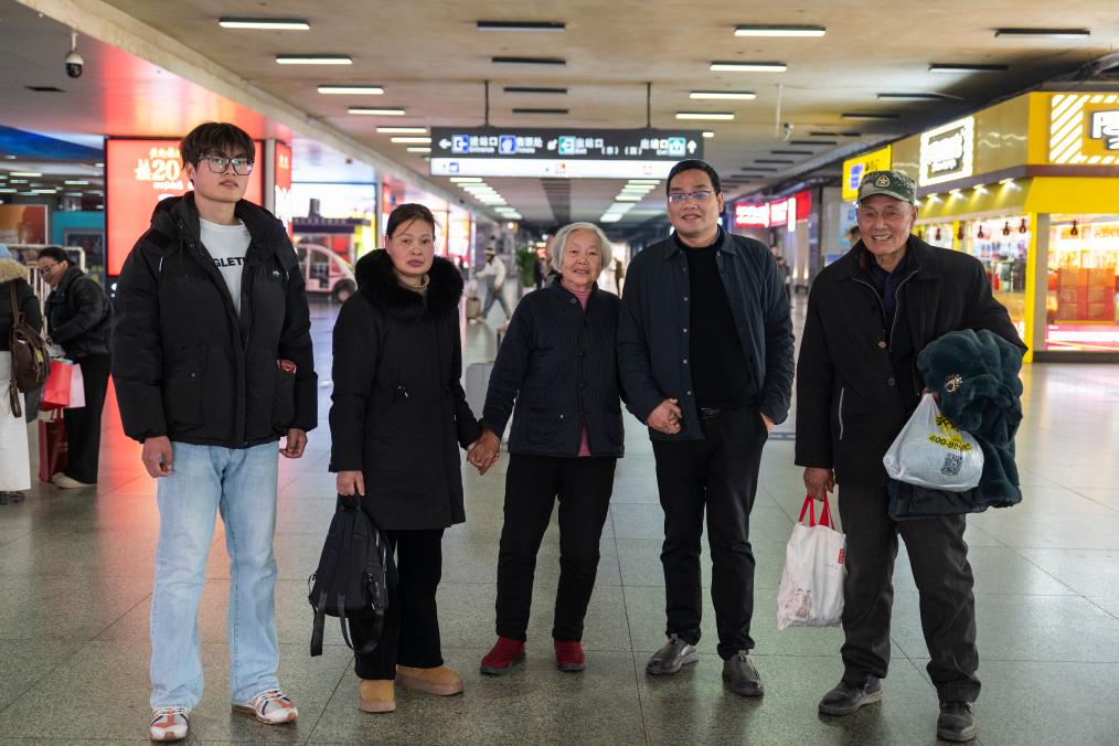2月14日,在武昌站,邹先生(右二)和家人合影。邹先生在武汉工作,此前每年都是回老家湖北仙桃过年,今年他第一次把在老家的父母接到武汉一起过年。