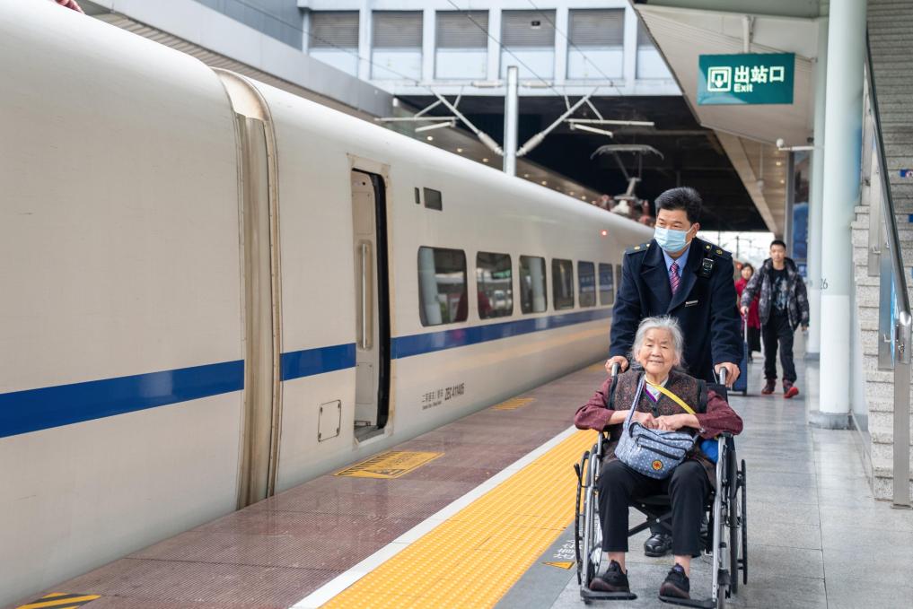 2月14日,在广西柳州站,车站工作人员使用轮椅协助“银发”旅客进站上车。