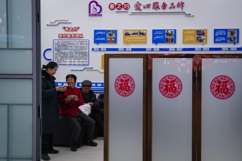 2月12日,在长春火车站“春之约”爱心服务站,工作人员马丛(左)叮嘱年过七旬的吴世豪(中)、徐茂运夫妇换乘注意事项。徐茂运和吴世豪老两口从山东老家去吉林蛟河看望女儿,在长春换乘,女儿提前预约了“春之约”爱心服务班组,帮助引导他们换乘列车。