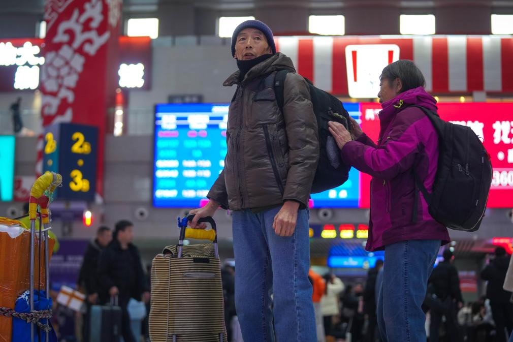 2月14日,家住河南周口、今年69岁的李先生和老伴行走在周口站站台,他们准备乘车前往广州与家人团聚,共度新春佳节。