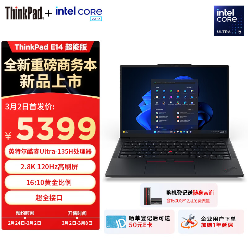 IT之家 2 月 27 日消息,联想现已在京东上架 2026 款 ThinkPad E14 笔记本超能版,该机搭载酷睿 Ultra 5 135H 处理器 + 16GB RAM + 1TB SSD,提供 40W 性能释放,定价为 5399 元。