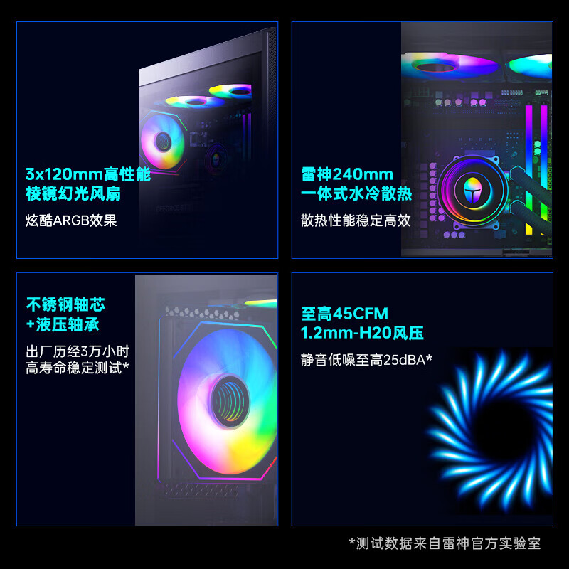 这款电脑还带有雷神自家 240mm 一体式水冷散热,标配 16GB DDR5 高频内存、1TB PCIe 4.0 固态硬盘,配备 650W 80 PLUS 电源,支持蓝牙 5.3 + WiFi 6E,前面板提供了 USB 3.0、USB 2.0 以及 3.5mm 音频接口。