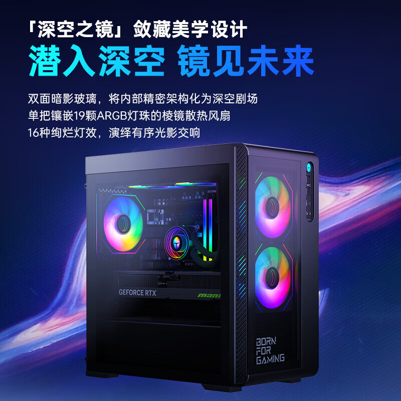 IT之家注意到,这款电脑的机箱容积为 30L,采用“深空之镜”敛藏美学,配备双面暗影玻璃,自带的风扇镶嵌 19 颗 ARGB 灯珠,可呈现 16 种炫彩灯效,正 / 侧双面均有暗影透视玻璃,顶部还带有免工具可拆卸防尘网,方便随时清灰。