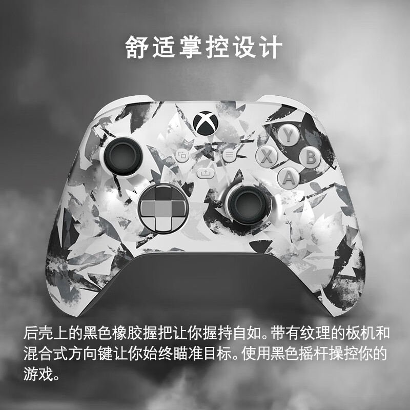 这款手柄采用经典的灰黑配色,正面外壳为白色不透明材质,搭配黑、灰色装饰图案,背部外壳为经典黑色,肩键、按键则采用纯黑色、白色。