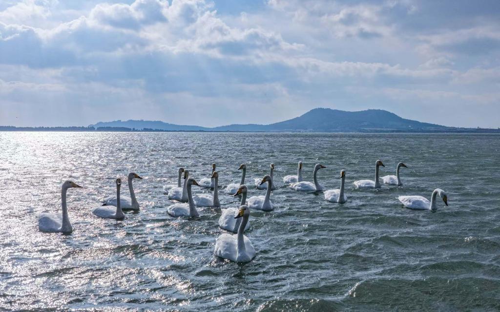 在威海荣成天鹅湖畔,大天鹅如雪白的精灵,与碧海蓝天构成和谐画卷。作为鸟类南迁北移的重要中转站,荣成是亚洲最大的大天鹅越冬栖息地之一,每年有成千上万只大天鹅从西伯利亚等地来此越冬。成群结队的大天鹅在湖面上游弋,场面蔚为壮观。