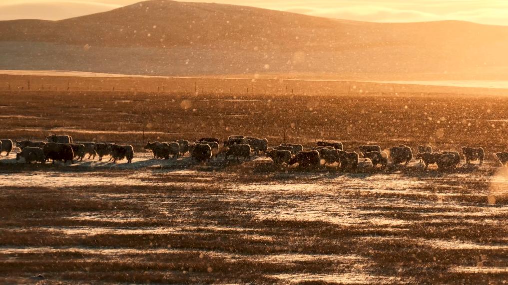 锡林郭勒的落日时分,漫天雪花碎金般飞舞。骆驼群沉稳徜徉,白牦牛群悠闲食草,夕阳逆光让它们的身影镀上一层温暖金边。