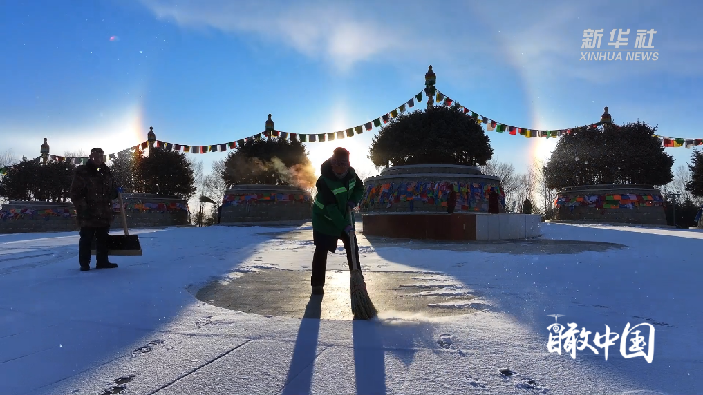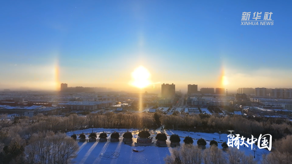近日,内蒙古自治区锡林浩特市迎来入冬后最低气温。雪后初霁,朝阳升起,高空冰晶与晨雾交织,在阳光的折射下形成罕见的幻日奇观,天地间光影流转,如梦似幻。