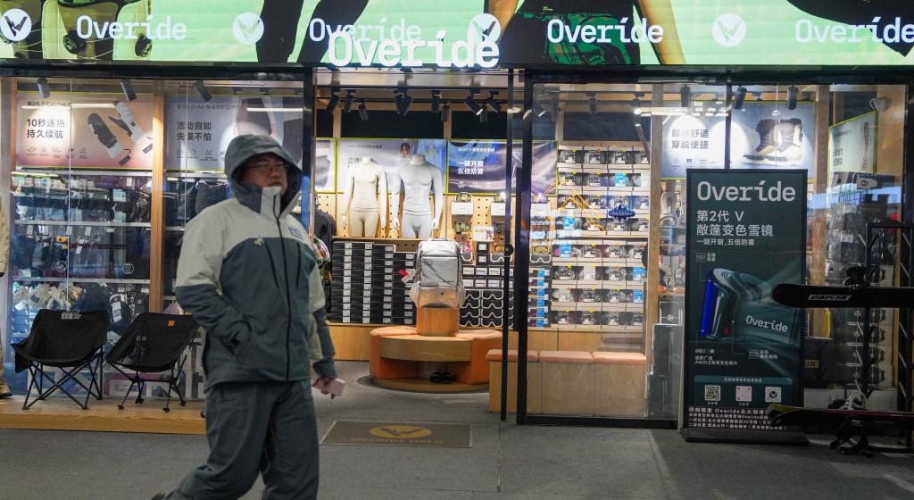 12月2日,在吉林市北大湖滑雪度假区,游客经过一家国产品牌雪具店。(新华社记者 颜麟蕴 摄)
