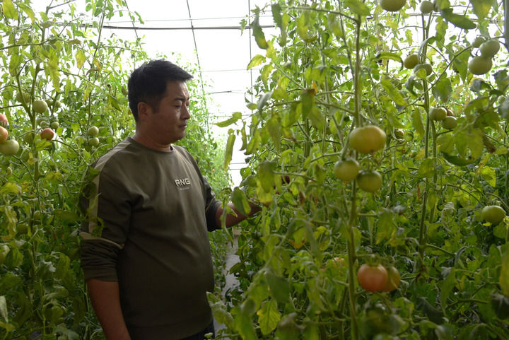 2025年11月14日,甘肃省酒泉市肃州区金佛寺镇上三截村村民李军国在查看番茄长势。新华社记者 王朋 摄