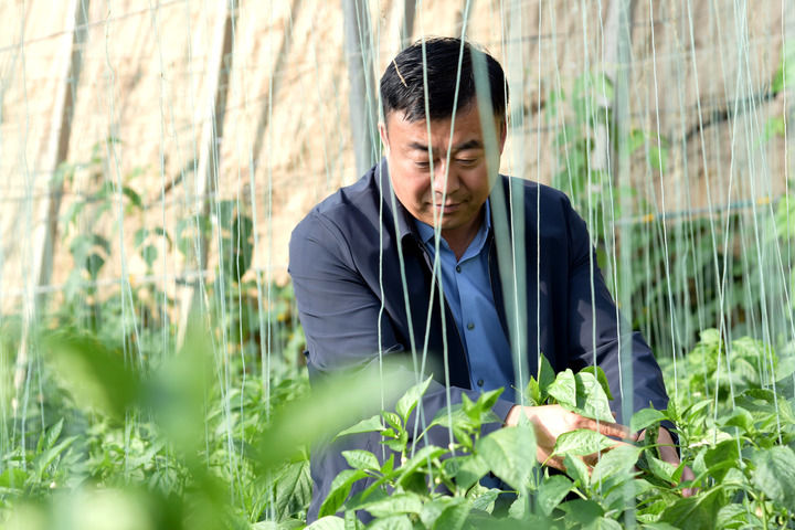 2025年11月12日,在甘肃省张掖市甘州区党寨镇马站村有机蔬菜园,马兆存在查看辣椒长势。新华社记者 王朋 摄