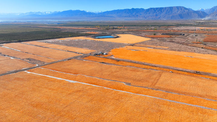 这是2025年10月13日在甘肃省张掖市甘州区一处荒滩拍摄的玉米种子晒场(无人机照片)。新华社发(李自海摄)