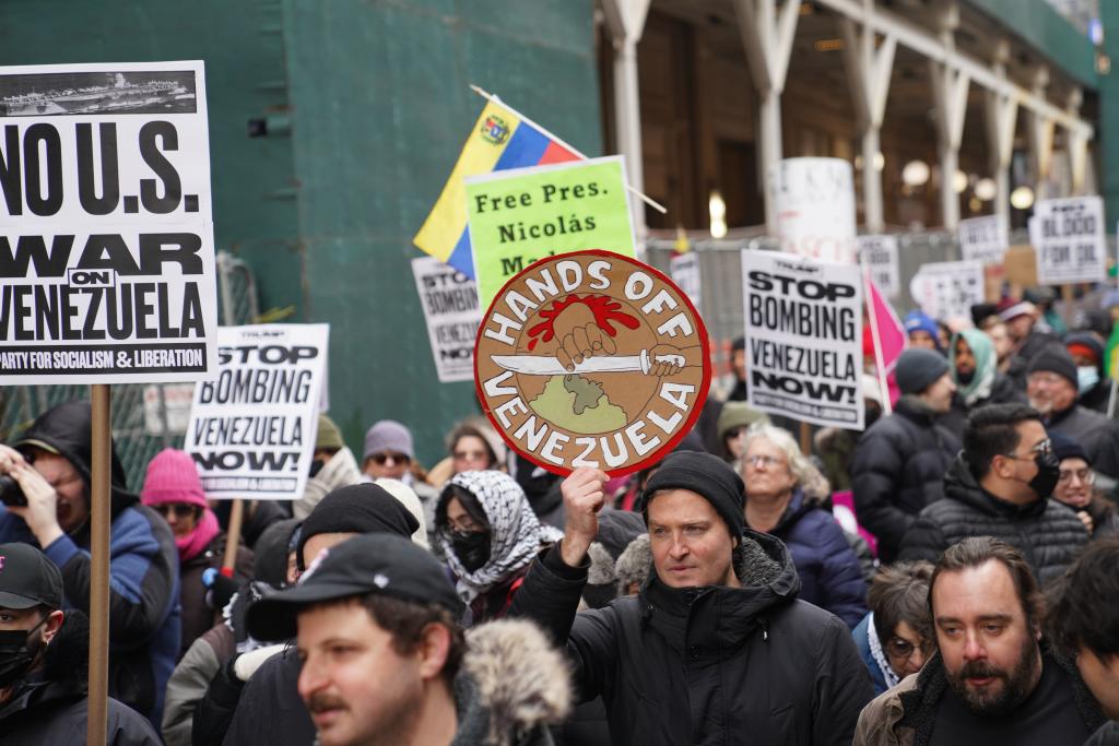 1月3日,在美国纽约,民众参加抗议集会。当日,近千名民众在美国纽约举行集会游行,抗议美国对委内瑞拉实施军事打击。新华社记者 张凤国 摄